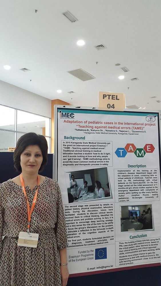 7-9 April 2017 the international conference on medical education "Health Professions Education without Borders" (IMEC - 2017) was held in Kuala Lumpur (Malaysia). Head of the Department of Children's Diseases №2 of KSMU, Professor BT Tukbekova took part in the poster-presentation session "Technology Enhanced Learning (TEL)" with a report on the topic "Adaptation of pediatric cases in the international project" Teaching against medical errors (TAME) ". The presented information contained the results of training on the basis of virtual patients cases using special computer program OpenLabyrinth. Professor presented main goals and tasks of international project. The poster gained the interest of participants, there were highlighted the importance and usefulness of project results.